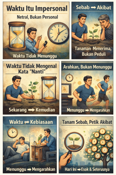 Waktu tidak peduli apakah kita menanam kebiasaan, pengetahuan, kesalahan, atau penyesalan. Ia tetap menyimpan semuanya sebagai potensi akibat di masa depan.